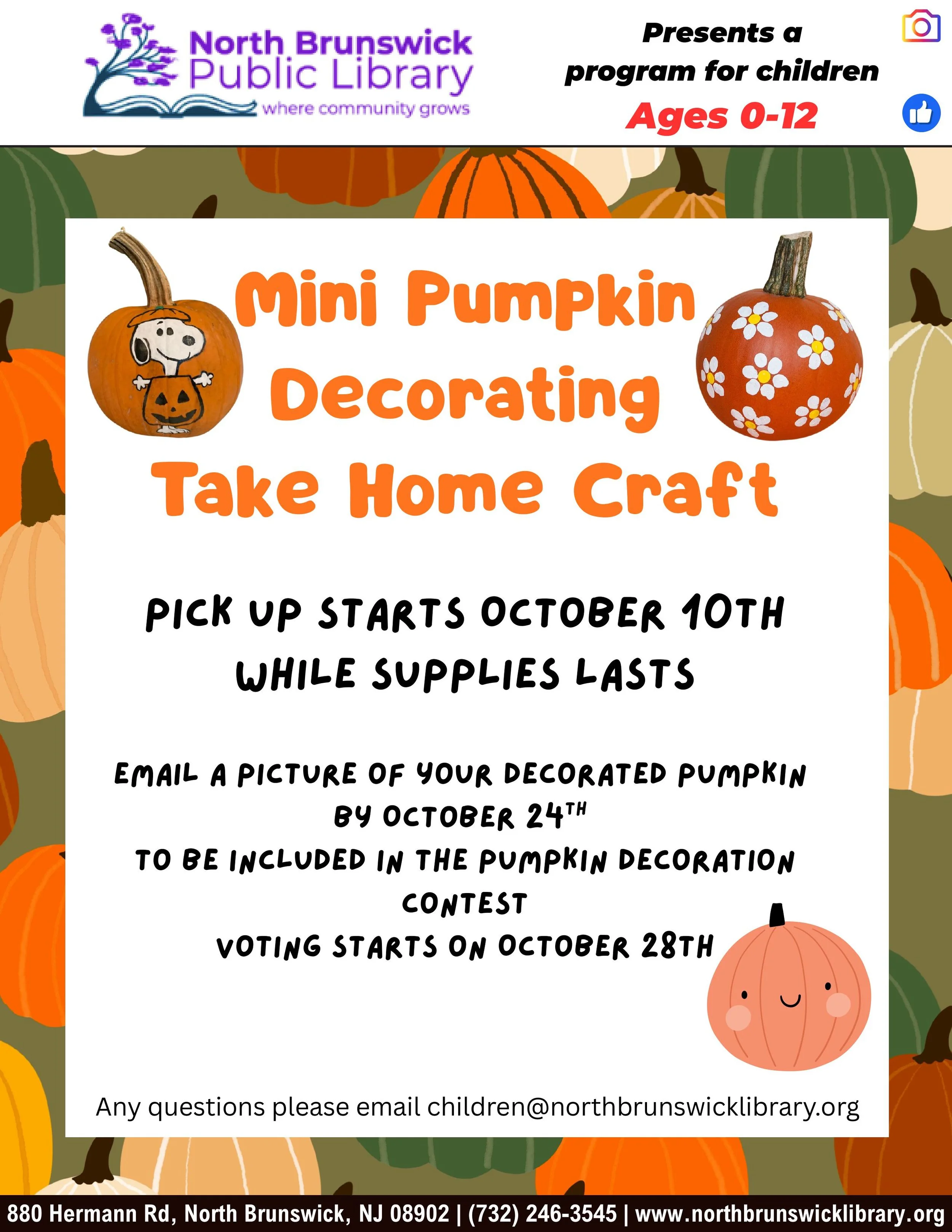 Oct 10 to Oct 24 Children's Programs Mini Pumpkin Decorating Take Home Craft Fri, Oct 10, 2025 9:30 AM 09:30 Fri, Oct 24, 2025 5:00 PM 17:00 North Brunswick Public Library (map) Google Calendar ICS View Event →