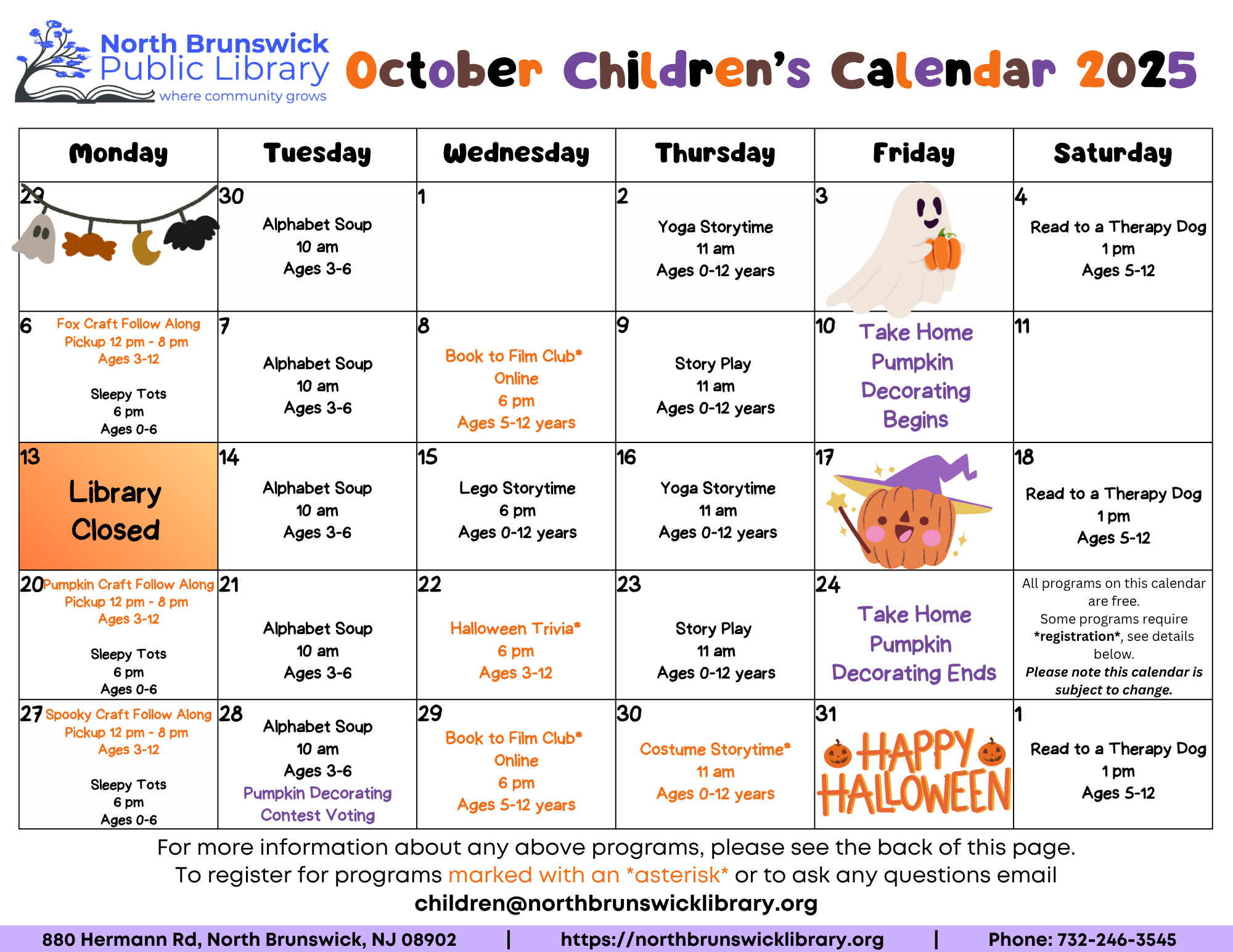 Oct 1 to Oct 31 Children's Programs October Children's Calendar 2025 Wed, Oct 1, 2025 9:00 AM 09:00 Fri, Oct 31, 2025 5:00 PM 17:00 North Brunswick Public Library (map) Google Calendar ICS View Event →