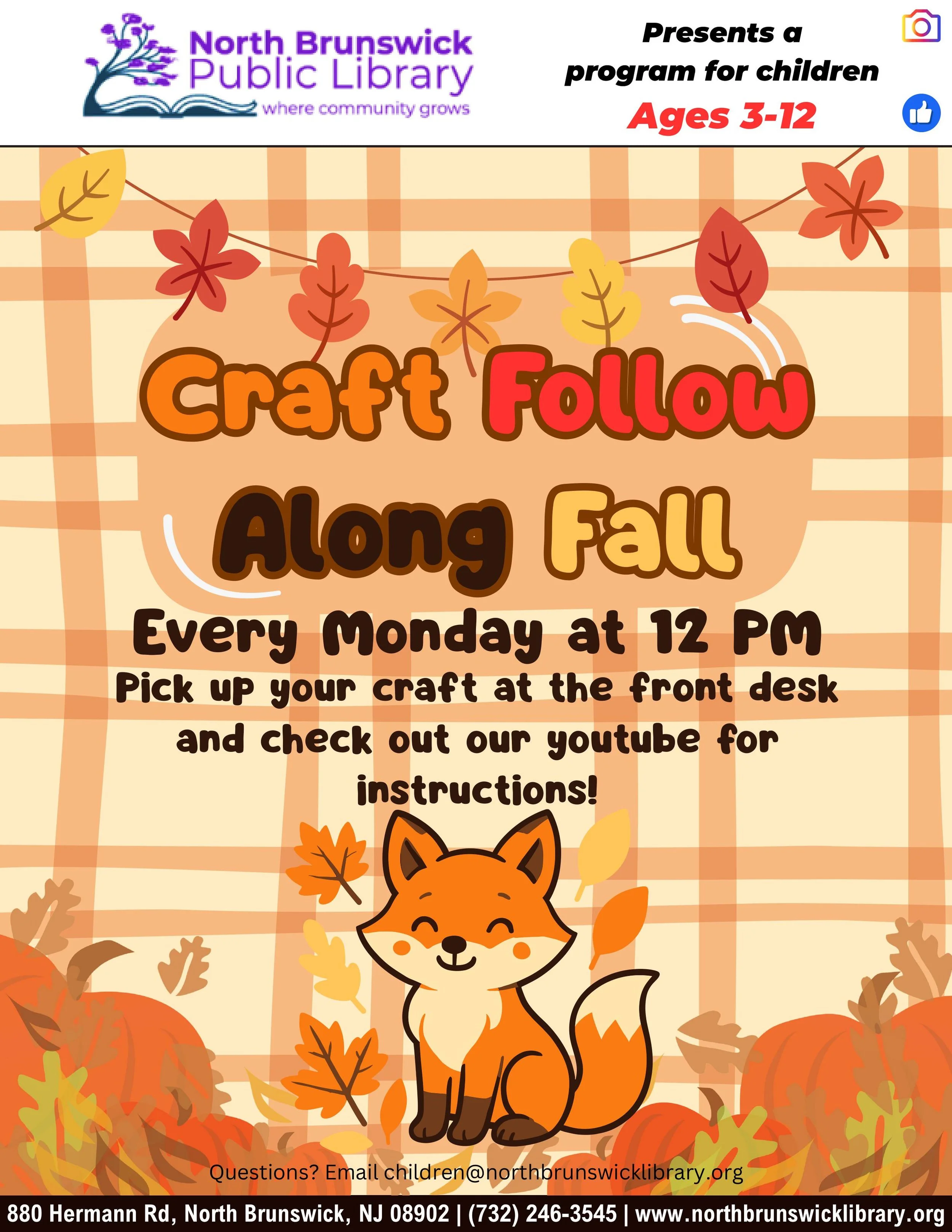 Oct 27 12:00 PM12:00 Children's Programs Fall Craft Follow Along Monday, October 27, 2025 12:00 PM 8:00 PM 12:00 20:00 North Brunswick Public Library (map) Google Calendar ICS View Event →