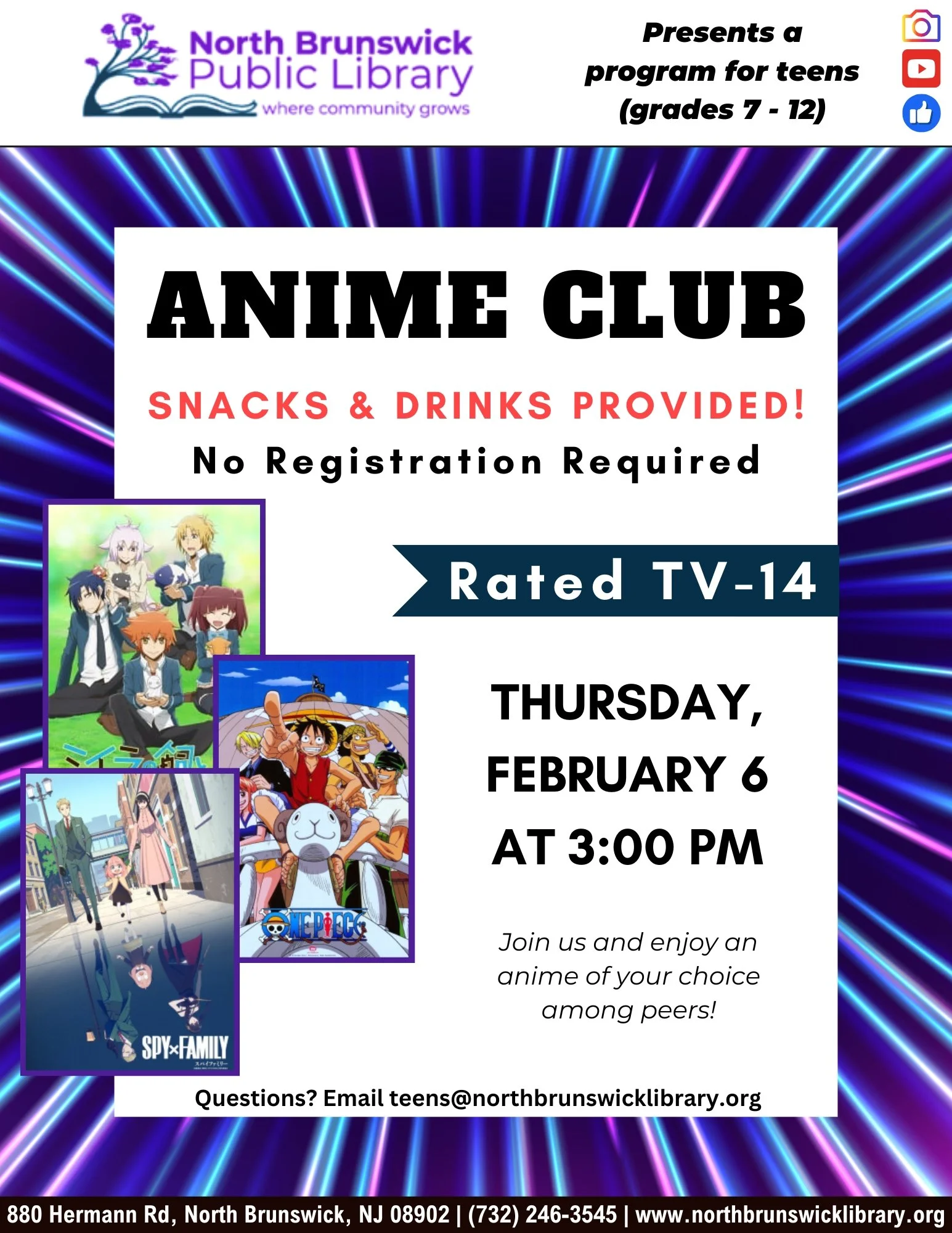 Feb 6 3:00 PM15:00 Indoor Library Program, Teen Programs Anime Club Thursday, February 6, 2025 3:00 PM 4:00 PM 15:00 16:00 North Brunswick Public Library (map) Google Calendar ICS View Event →